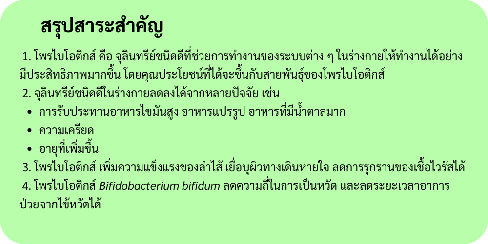 จากบทความจะเห็นว่า แม้ว่าโพรไบโอติกส์ที่นำมาใช้ในการศึกษาจะมีหลายชนิดและหลายกลุ่ม แต่มีเพียงไม่กี่ชนิดที่มีประโยชน์ต่อระบบภูมิคุ้มกัน Bifidobacterium bifidum เป็นหนึ่งในจุลินทรีย์ที่มีประโยชน์ในด้านของการส่งเสริมการทำงานของระบบภูมิคุ้มกันในร่างกาย เนื่องจาก Bifidobacterium bifidum เป็นจุลินทรีย์ชนิดดีที่พบมากในลำไส้ของทารกที่ดื่มนมแม่ มีบทบาทสำคัญต่อการพัฒนาระบบภูมิคุ้มกัน และการดูดซึมสารอาหาร ซึ่งปริมาณของจุลินทรีย์กลุ่ม Bifidobacterium ในลำไส้จะลดลงตามอายุ ส่งผลให้เรามีระบบภูมิคุ้มกันที่แย่ลงตามอายุที่เพิ่มมากขึ้นเช่นกัน