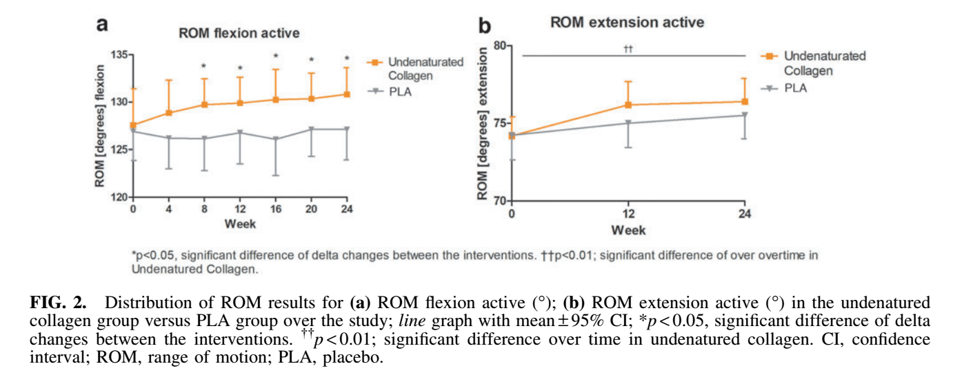 จากการศึกษาทางคลินิก พบว่า UC-II® มีส่วนช่วยในการเพิ่มองศาการงอเข่าและเหยียดข้อได้ โดยหลังรับประทาน UC-II® นาน 24 สัปดาห์ สามารถงอเข่าได้เพิ่มขึ้น 3.23 องศา เทียบกับ 0.21 องศาในกลุ่มที่รับประทานยาหลอก โดยเพศหญิงจะเห็นความแตกต่างที่ดีกว่าคือสามารถงอเข่าได้เพิ่มมากขึ้นถึง 4.79 องศา และเหยียดข้อได้เพิ่มขึ้น 2.21 องศาเทียบกับ 1.27 องศาในกลุ่มที่รับประทานยาหลอก โดยเห็นความแตกต่างที่ดีขึ้นตั้งแต่สัปดาห์ที่ 8 หลังรับประทาน UC-II®