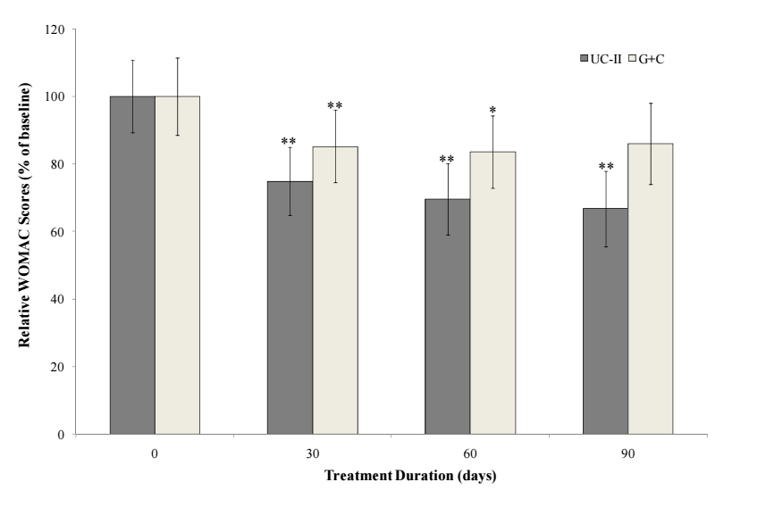 มีการศึกษาทางคลินิกที่ชี้ให้เห็นว่า UC-II® ช่วยบรรเทาอาการข้อเข่าเสื่อมได้ดีกว่าการรับประทานสารกลูโคซามีน (glucosamine) และสารคอนดรอยติน (chondroitin) ที่เป็นส่วนหนึ่งในการรักษาโรคข้อเข่าเสื่อม โดยพบว่าการเปลี่ยนแปลงของคะแนนการประเมินประสิทธิภาพของการรักษา ซึ่งประเมินจากความเจ็บปวด ความยืดหยุ่น และการทำงานของข้อ หรือ WOMAC scores ดีขึ้นหลังจากรับประทาน UC-II® 40 mg นาน 90 วัน เมื่อเทียบกับกลุ่มที่รับประทานสารกลูโคซามีนและสารคอนดรอยติน