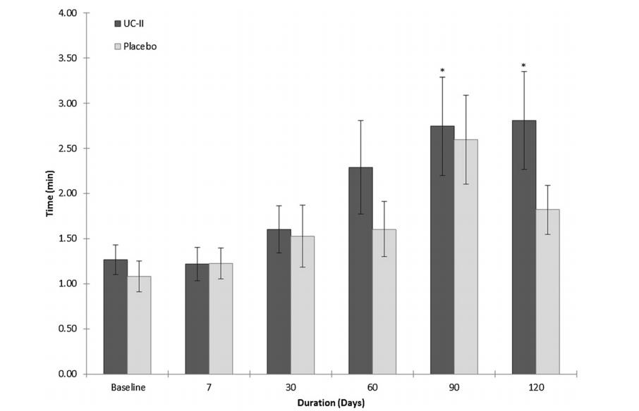 และการรับประทาน UC-II® นาน 90 วัน สามารถเพิ่มระยะเวลาการใช้งานของข้อโดยไม่มีอาการปวดได้อย่างมีนัยสำคัญทางสถิติเมื่อเทียบกับกลุ่มที่รับประทานยาหลอก