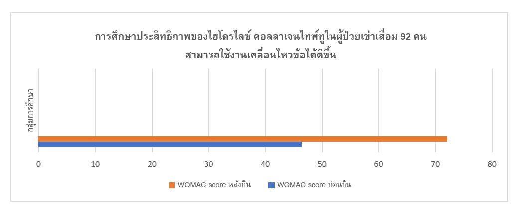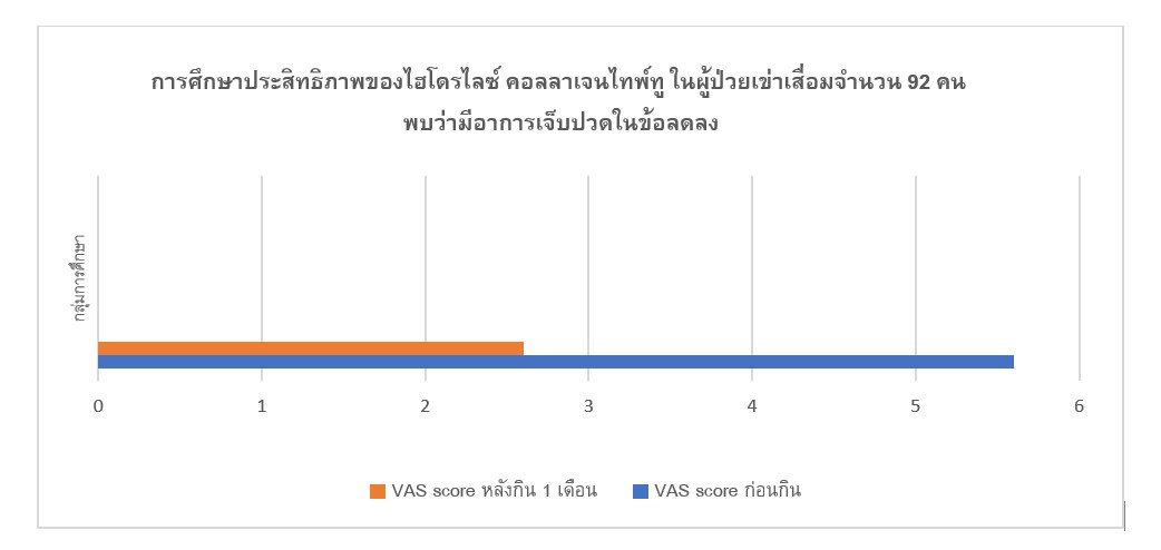 จากการศึกษาทางคลินิกในผู้ป่วยโรคข้อเข่าเสื่อมที่รับประทานไฮโดรไลซ์ คอลลาเจนไทพ์ทู เป็นเวลา 30 วัน พบว่าผู้ป่วยมีความรุนแรงของอาการปวดข้อลดลง นำไปสู่การใช้ยาบรรเทาอาการปวดที่ลดลง และเมื่อประเมินประสิทธิภาพของการรักษา จากความเจ็บปวด ความยืดหยุ่น และการทำงานของข้อ พบว่าผู้ป่วยมีการเคลื่อนไหวของข้อดีขึ้น