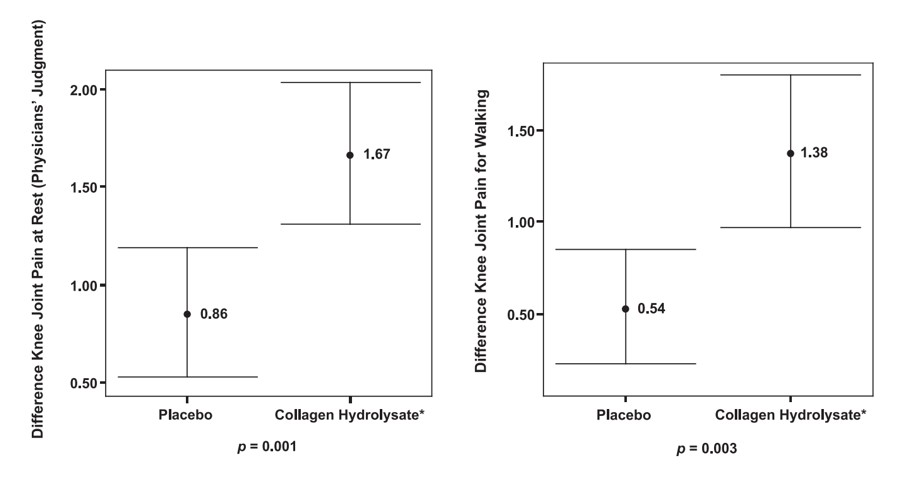 นอกจากนี้ยังพบประสิทธิภาพการบรรเทาอาการปวดในกลุ่มนักกีฬาที่รับประทานไฮโดรไลซ์ คอลลาเจนไทพ์ทู เป็นเวลา 24 สัปดาห์ พบว่าอาการปวดขณะเดินและยืนลดลงเมื่อเทียบกับกลุ่มที่ไม่ได้รับประทานไฮโดรไลซ์ คอลลาเจนไทพ์ทู