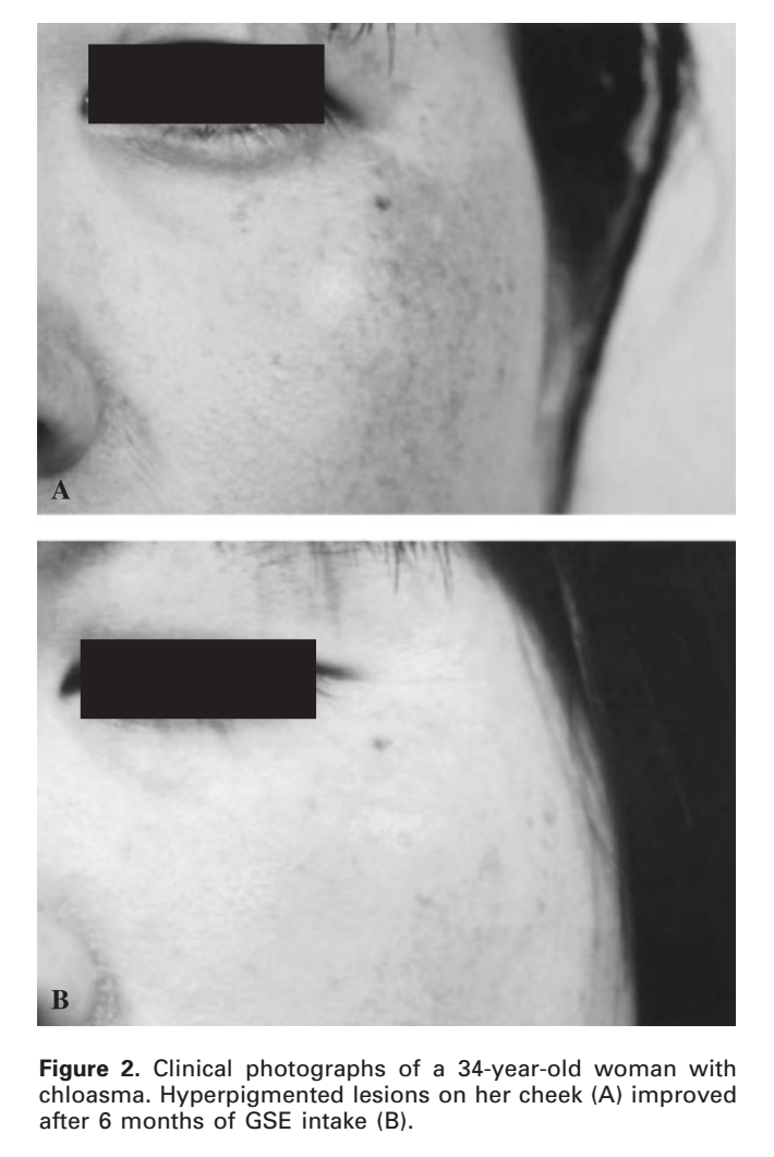 จากการศึกษาพบว่าโปรแอนโธไซยานิดินส์ (proanthocyanidin) เป็นสารต้านอนุมูลอิสระที่พบมากในเมล็ดองุ่นสามารถยับยั้งการทำงานของเอนไซม์ไทโรซิเนส (tyrosinase) ซึ่งเป็นเอนไซม์ที่กระตุ้นให้เกิดการสร้างเม็ดสีในผิวหนัง เพิ่มการไหลเวียนโลหิตในชั้นผิวหนังส่งผลให้เกิดการผลัดเปลี่ยนเซลล์ผิวหนัง ลดการสร้างเม็ดสีที่ผิวหนัง และลดขนาดของฝ้าหลังจากโดนรังสีอัลตราไวโอเลตได้ โดยพบว่าร้อยละ 41 ของผู้บริโภคมีรอยฝ้าจางลง หลังรับประทาน grape seed extract นาน 3 เดือน และเพิ่มเป็นร้อยละ 83 หลังรับประทานนาน 6 เดือน นอกจากนี้ยังยังเพิ่มความชุ่มชื้นของผิวหนังด้วย